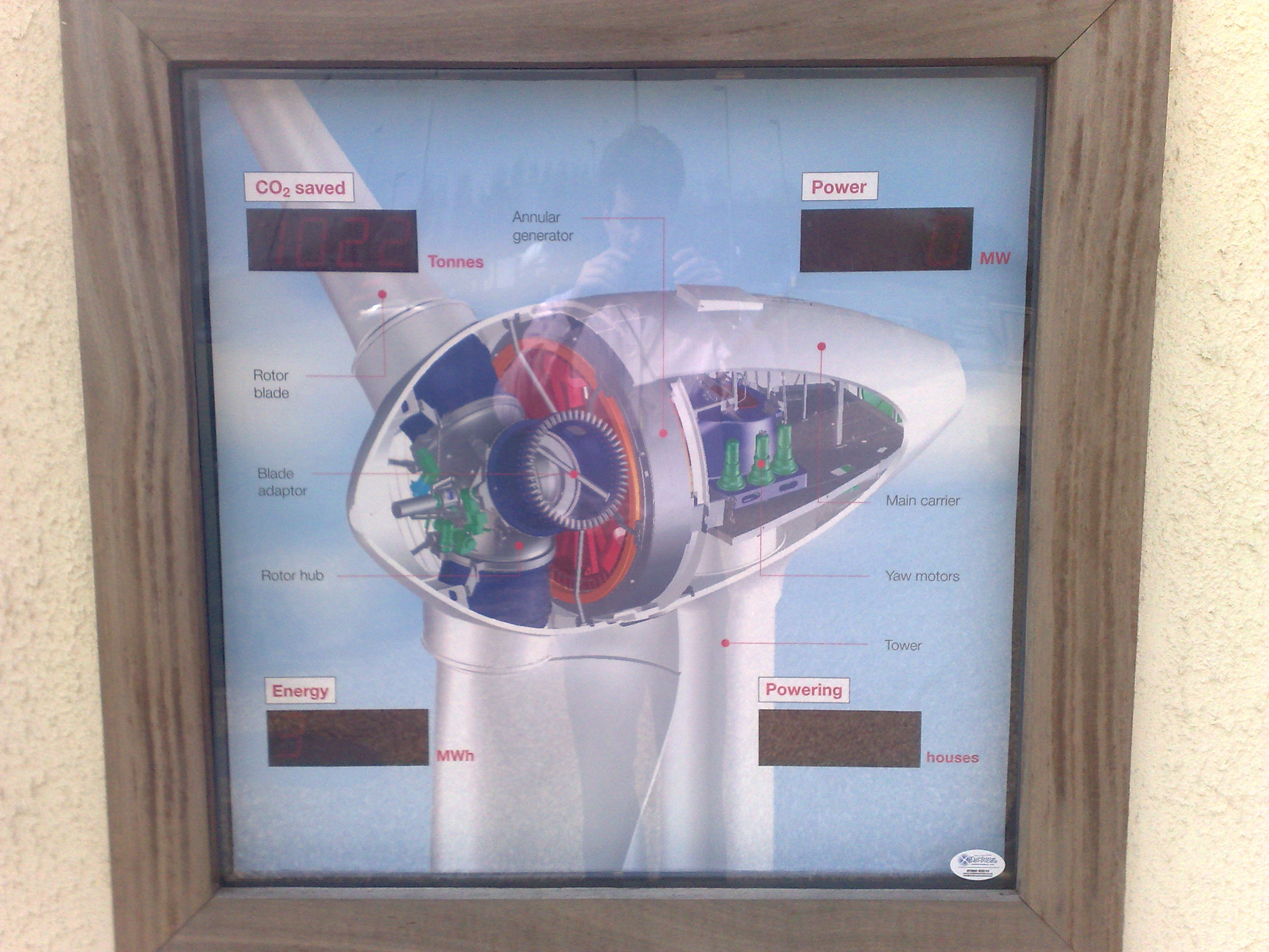 What was quite interesting was the way this turbine works. There is no actual gearbox in there, apparently the 'Annular Generator' is driven by the blades directly. I assume that this must be a DC generator which then feeds a large invertor (there were some large green enclosures round the back which made a fairly high pitched whining.