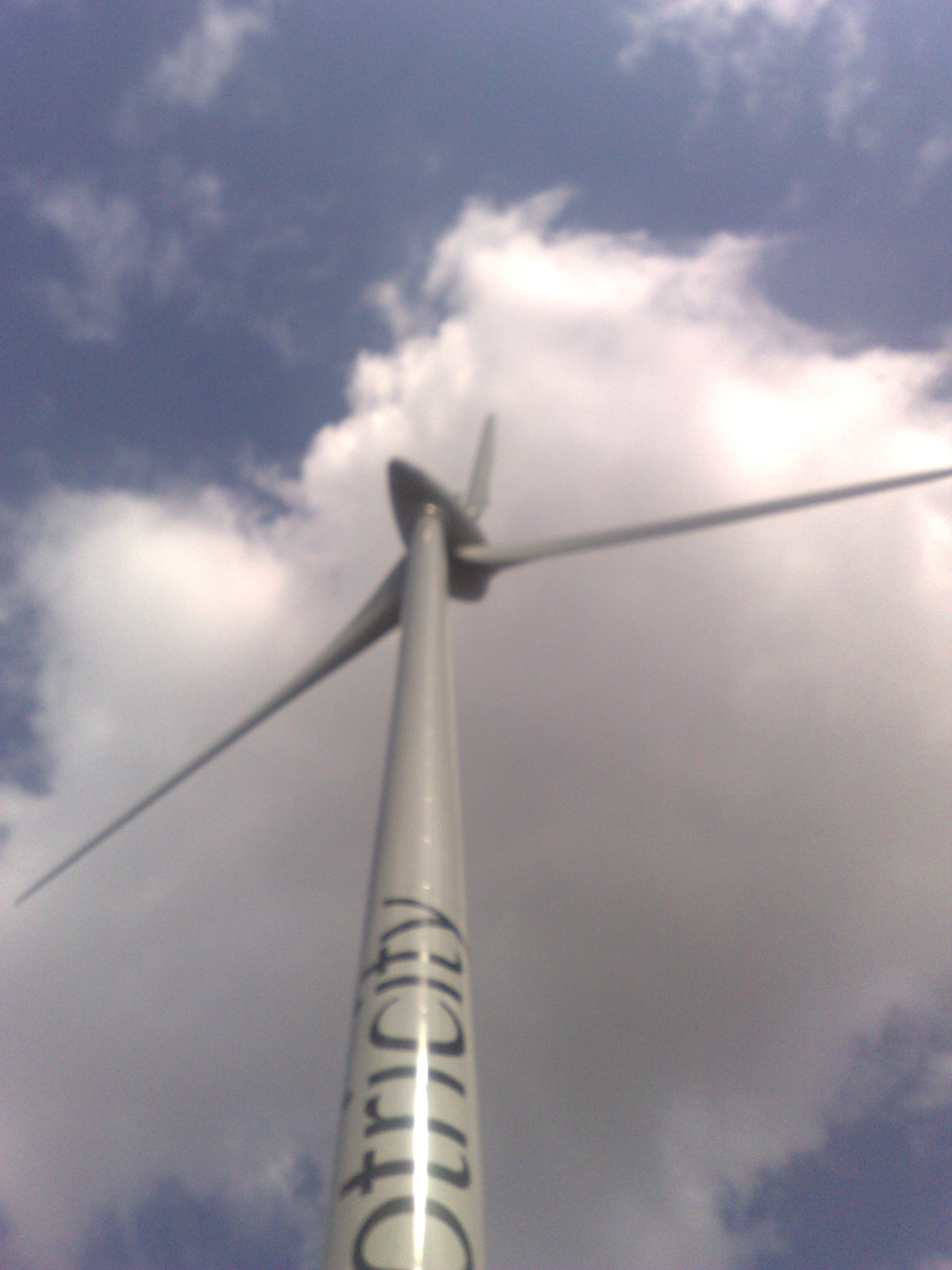 What was quite interesting was the way this turbine works. There is no actual gearbox in there, apparently the 'Annular Generator' is driven by the blades directly. I assume that this must be a DC generator which then feeds a large invertor (there were some large green enclosures round the back which made a fairly high pitched whining.