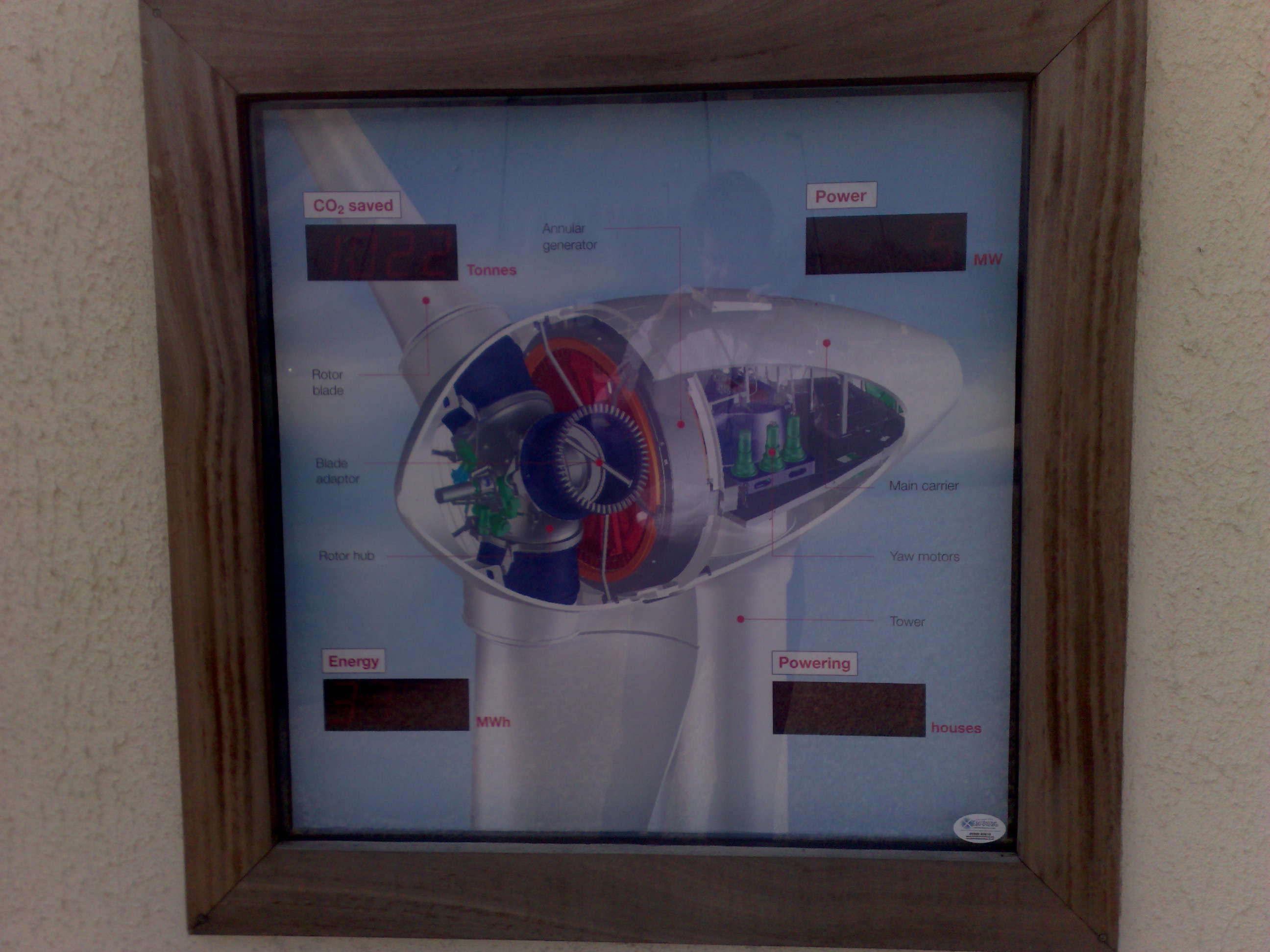 It's apparently capable of some 2MWatts with sufficient wind, but today(being fairly calm) it was mainly reading 0.000MW although it did climb to 0.028MW (28KiloWatts) for a short time.